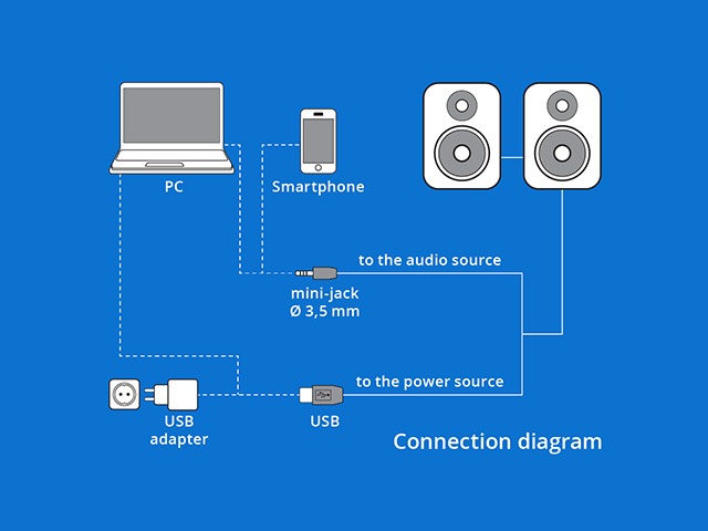 Want to connect your speaker system to a computer or mobile device? It's quick and easy. Just connect your speakers to an audio source using a 3.5 mm mini-jack cable. The system requires power: plug the USB adapter into a wall outlet or use a device's USB port. Enjoy high-quality sound with minimal setup!
