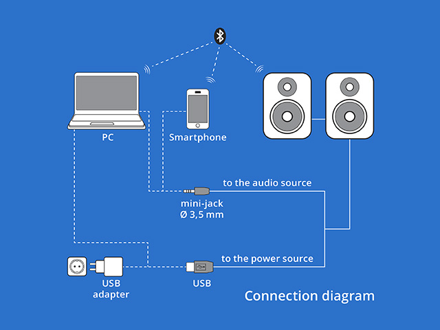 You can pair your speakers with an audio source — like a computer or smartphone — in two ways by connecting wirelessly via Bluetooth to your mobile device or using a 3.5 mm mini-jack cable for a wired connection to your computer or another source. The system requires power: simply plug the USB adapter into a wall outlet or use a device's USB port. Enjoy high-quality sound with minimal setup!
