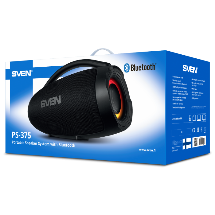 Introducing portable speaker system SVEN PS-375 — designed for those who appreciate powerful bass, crisp high frequencies, and the freedom to move without being tethered to a power outlet.