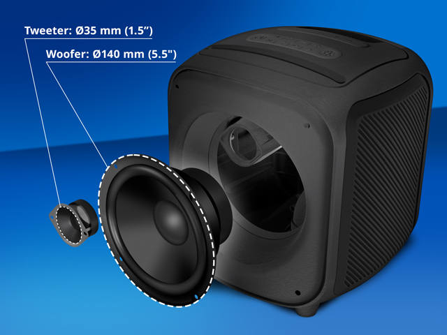 High frequencies are reproduced by a speaker with a diameter of 35 mm, and a large speaker with a diameter of 140 mm is responsible for solid and accented bass. Together they produce 65 W of clear and surround sound that can stir up not only a room but also a dance floor outside. Do you want to switch from dancing to singing? Easily! The audio system is equipped with a microphone input, the wired microphone itself is provided with the device. You should only connect it, launch your favorite backing track and start singing.