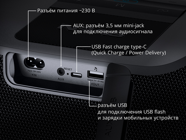 Вы можете использовать стандартный AC кабель для зарядки от розетки или пользоваться портом USB Type-C, который поддерживает технологии быстрой зарядки QC (Quick Charge) и PD (Power Delivery). USB Type-C позволяет заряжать колонку от внешнего аккумулятора.