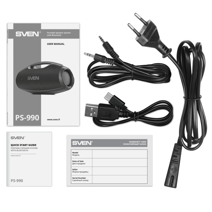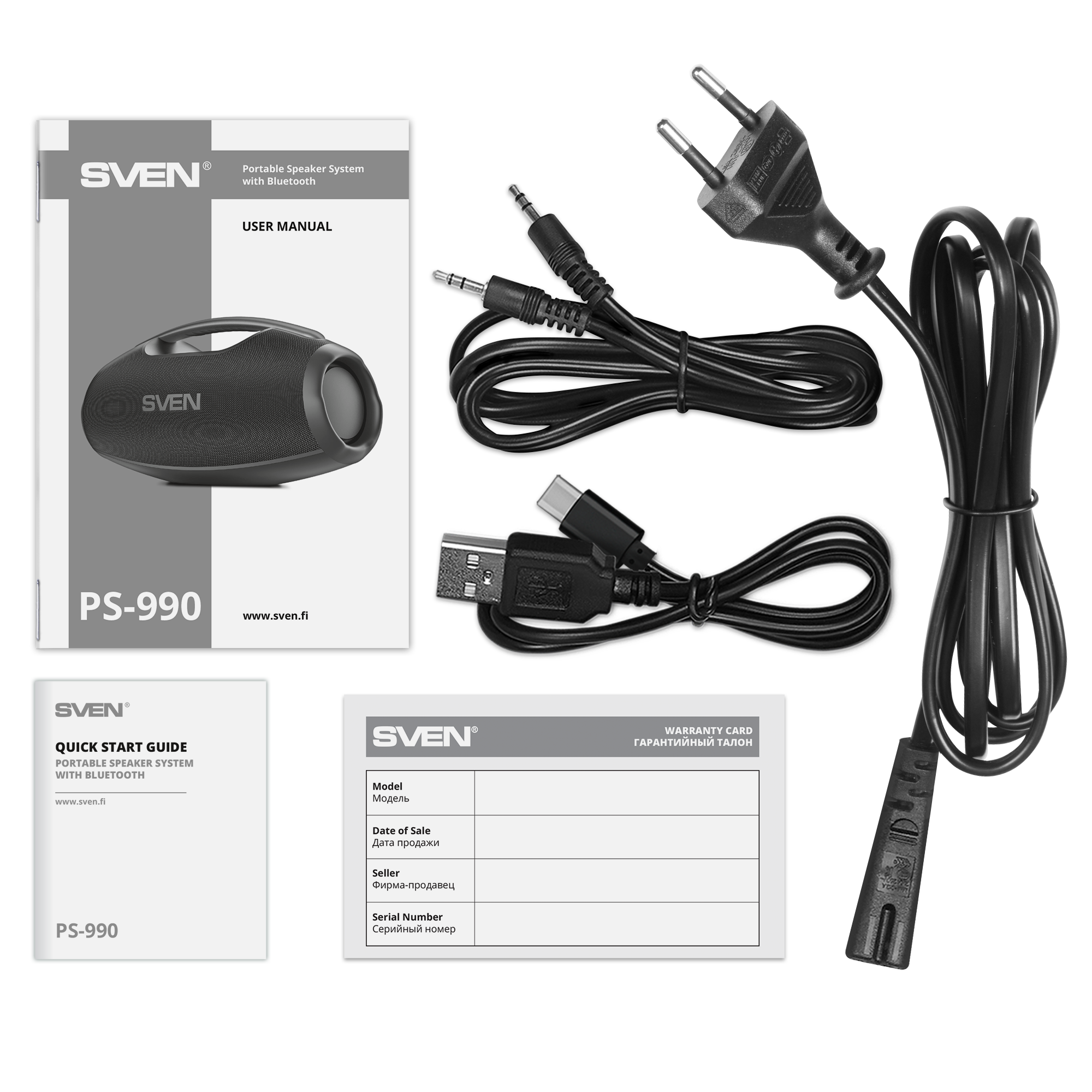 Дизайн у PS-990 — лаконичный и современный. Плавные формы делают корпус визуально легким: колонка не выглядит громоздкой, но при этом сохраняет внушительность. Аккумулятор емкостью 11,1 В, 5200 мA·ч (57,72 Вт·ч) обеспечивает до 16 часов автономной работы. Заряжать ее можно двумя способами: от сети 220 В с помощью комплектного кабеля или через USB Type-C с поддержкой Quick Charge и Power Delivery — в зависимости от ситуации. SVEN PS-990 одинаково уверенно чувствует себя и на открытой площадке, и в квартире, и на даче, обеспечивая мощный звук и атмосферу праздника.