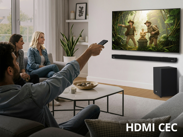 Поддержка HDMI CEC* позволяет включать/выключать аудиосистему и регулировать её громкость с помощью пульта ДУ подключенного по HDMI телевизора.